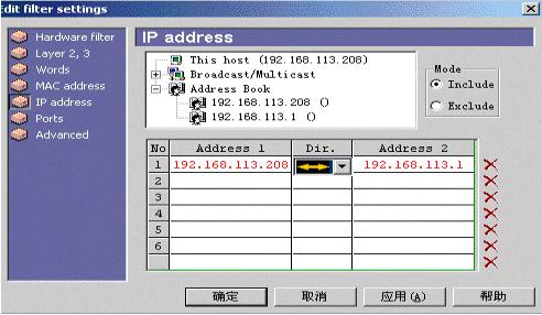 2)用热键CTRL+E弹出如图所示过滤设置,选择左栏“IP address”,右栏按下图将address book中的地址拽到下面,设置好后确定,这样就这抓这两台计算机之间的包。