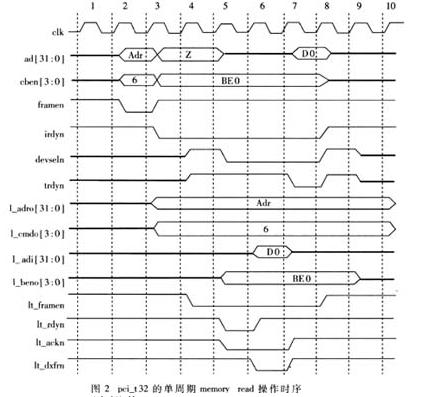 pci规范中定义了两种读写操作,即Memory和I/O的读写。Pci_t32的读写操作包括:32位的Memory单周期读写、Memory猝发读写、I/O单周期读写以及配置读写。Pci_t32 的Memory读写分为单周期和猝发两种模式,而I/O的读写只有单周期模式。所谓猝发模式,即在给出首地址后,主设备连续读写多个数据,用户设备应能对首地址自动加1。配置读写是指pci主设备对pci_t32的配置空间寄存器进行读写操作,pci主设备与pci_t32之间的接口是无缝连接。本文只分析32位Memory单周期读写时序,其它模式的读写时序大同小异,此略。