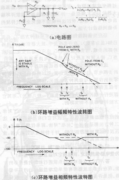 答:为简单起见,可将放大器看成一个振荡器。每个运放都有一个内部输出电阻RO,当它与容性负载相接时,在运放传递函数上产生一个附加的极点。正如图1(b)波特图幅频特性曲线表示,附加极点的幅频特性斜率比主极点20dB/十倍频程更徒。从相频特性曲线图1(c)中可以看出,每个附加极点的相移都增加-90°。我们可用图1(b)或图1(c)来判断电路的稳定性。从图1(b)中可以看出,当开环增益和反馈衰减之和大于1时,电路会不稳定。同样,在图1(c)中,如果某一工作频率低于闭环带宽,在这个频率下环路相移超过-180°时,运放会出现振荡。电压反馈型运算放大器(VFA)的闭环带宽等于运放增益带宽积(GBP,或单位增益频率)除以电路闭环增益(A CL )。运算放大器电路的相位裕度定义为使电路不稳定所要求的闭环带宽处对应的附加相移(即环路相移十相位裕度=-180°)。当相位裕度为0时,环路相移为 -180°,此运放电路不稳定。通常,当相位裕度小于45°时,会出现问题,例如频响“尖峰”,阶跃响应中的过冲或“振铃”。为了使相位裕度留有余地,容性负载产生的附加极点至少应比电路的闭环带宽高10倍,如果不是这样电路可能不稳定。