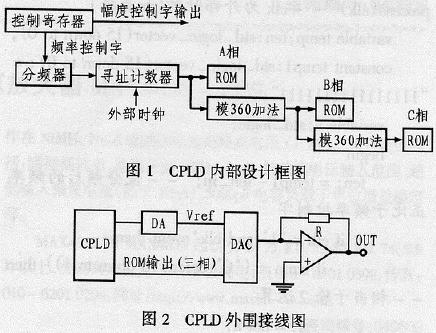 CPLD的内部结构框图如图1所示,图中,首先由控制寄存器将外部控制器(如单片机)送入的数据转换为频率和幅度控制字;然后再由分频器根据频率控制字进行分频并将输出作为寻址计数器的时钟;寻址计数器的寻址空间为360字节,可对ROM中的查找表进行寻址;而通过模360加法器可以产生120°的相位差。