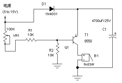 图示参数可适用于电压为5-15伏的装置。对于不同的电压条件,只需调整VR1使B1由工作到停止发出报警声即可。