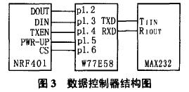 W77E58的串口0通过RS232/CAN 总线与主控制器相连,串口1连接nRF401通信模块,使用无线通信与各个无线终端节点通信,将各个终端采集到的数据汇总到控制单片机。电路结构如图3.