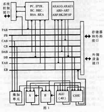 C5000系列内部硬件功能块如图1所示。其中,有:40bit算数逻辑单元(ALU);两个40bit累加器A和B;17×17bit乘加单元(40bitMAC ,可作64级FIR运算而不必考虑溢出;