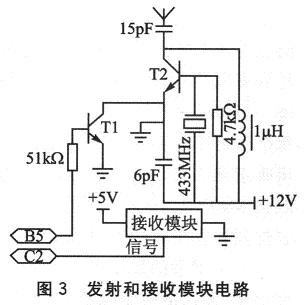 采用433 MHz高频发射和接收模块。433 MHz的高频发射电路在控制脚为高电平时起振并发射等幅高频信号,当控制脚为低电平时停止振荡。因此,可以用控制脚对高频电路完成幅度键控(ASK调制),相当于调制度为100%的调幅。当接收模块接收到433 MHz的等幅高频信号时,信号脚就输出高电平,否则输出低电平。所以接收信号脚的高低电平变化会与发射控制脚的高低电平变化相对应。多个接收模块可以同时接收到同一个发射模块发射的信号,可以实现一机发送,多机同时接收。图3所示电路是高频433 MHz载波的发射和接收模块。433 MHz的高频发射电路在控制脚B5为高平时,三级管T1导通,T2射级接地起振并发射等幅高频433 MHz的信号;当控制脚B5为低电平时,就停止振荡。因此,可以用控制脚B5对高频电路完成幅度键控(ASK调制),相当于调制度为100%的调幅。当接收模块接收到433 MHz的等幅高频信号时,信号脚就输出高电平到C2口,若未收到433 MHz的等幅高频信号则输出低电平。所以接收信号脚的高低电平变化会与发射控制脚的高低电平变化相对应。例如给B5引脚输入图4所示的波形,那么在接收模块的C2引脚上也将出现同样的波形。注意,B5和C2的控制信号分别由主控芯片PIC16F877A的RB5和RC2发出。