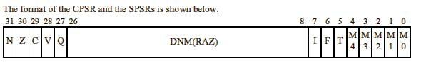 ii.SPSR:保存的程序状态寄存器,每种异常模式下都有自己的SPSR,一共有5种SPSR,即SPSR_irq、SPSR_fiq、SPSR_svc、SPSR_abt、SPSR_und。usr和sys 态下没有 SPSR 。