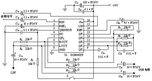 虚拟环绕声处理电路如图2所示。音频输入信号通过C15、C16输入进行信号处理后由PS9999的6、7脚输出,通过C25、C26送至功放电路。R5、R6、C19抽取左、右叠加信号送给有源低通滤波器电路,提取重低音信号。开关S为直通、虚拟环绕声处理选择开关,开关S闭合时为虚拟环绕声处理状态,开关S断开时为直通状态。