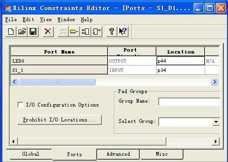 配置引脚连接在图11所示的画面中完成。在【Ports】页中,【Location】处输入图3中所示的引脚。例如:LED0被定为XC9536的第44脚,故在LED0一行输入p44,其他类推。Webpack Project Navigator就是这样将Verilog-HDL与硬件联系在一起的。配置完成后,从【File】中选择【Save】存盘,再选择【Exit】退出。