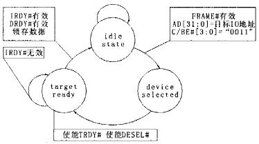 以目标设备I/O写为例:当帧有效信号(FRAME#)为有效(低电平)时,读传输开始,C/BE#[3:0]为“0011”,表明此交易为I/O写,同时AD[31:0]上的数据为此次交易的I/O地址。如果此I/O地址与我们设备配置寄存器中I/O基地址寄存器(base address register)的值相同,我们的目标设备就要通过使DESEL#有效来声明这次交易 作为主设备在有效FRAME#、I/O地址和C/BE#后,就在AD[31:0]上驱动要传输的数据,在C/BE#上驱动字节使能、同时使能目标准备好信号IRDY#,直到检测到目标设备有效的DRDY#信号后,此次交易中的主设备和目标设备就停止驱动各种信号。而目标没备在准备好接收数据后就可以使能DRDY#,此后目标设备检测到IRDY#时,就可以根据具体的字节使能C/BE#[3:0],将AD[31:0]总线上的数据进行锁存,从而完成整个交易。此交易的状态机如图1所示。
