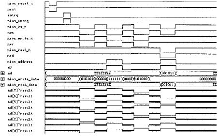 在Quartus II中对模块功能进行仿真,由于SL811HS是数据/地址复用端口,Nios II对其缓冲区写的时候,先把地址通过nios_write_data[7..0]发送到ad[7..0],然后把数据通过nios_write_data[7..0]发送到ad[7..0]。从SL811HS缓冲区读数据的时候,先把缓冲区地址通过nios_write_data[7..0]发送到ad[7..0],然后通过ad[7..0]读数据到nios_read_data[7..0]中。如图4所示。