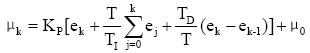 这样就可以让计算机或者单片机通过采样的方式实现PID 控制,具体的PID 控制又分为位置式PID 控制和增量式PID 控制,公式4 给出了控制量的全部大小,所以称之为全量式或者位置式控制;如果计算机只对相邻的两次作计算,只考虑在前一次基础上,计算机输出量的大小变化,而不是全部输出信息的计算,这种控制叫做增量式PID 控制算法,其实质就是求Δμ的大小,而Δμk =μk -μk-1 ;所以将式4 做自减变换有: