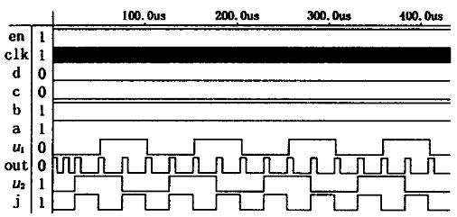 全数字锁相环原理如图2 所示, 其中: clk 为时钟频率,等于32f 0 ; U1 为输入,频率为f0 ; j 为异或门鉴相器的输出,它作为变模可逆计数器的方向控制信号;out 为加/ 减脉冲控制器的输出; U2 为DPLL 的输出,在相位锁定的频率为f0 , 相位与输入U1 相差Π/ 2 ; D、C、B 、A 可预置变模可逆计数器的模数,它在0001 —1111 范围内变化, 相应的模数在2.3 —2. 17 范围内变化; En 为可逆计数器使能端。