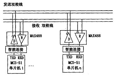 RS485 实现全双工通信:采用两对平衡差分信号线, R 为TTL/CMOS 接收端;RE为其使能端,低电平有效. D 为TTL/CMOS的发送端,DE 为其使能端,高电平有效. A 、B 为一对平衡线,RS485 通过它来接收和发送信号. 总线采用RS - 485 模式,用MAX88 完成收发功能. 如距离较远时,在中途进行接收并放大.多机通信网络电路如图5 所示.