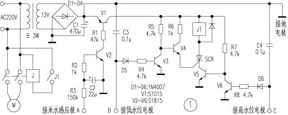 电路原理如图1所示,由于水路本身就是一个良好的接地体,因此本电路把水路和地阻作为三极管V2、V3、V6偏置电路的一部分。将电源正极接地后,各电极只需一根导线即可完成对有关三极管的触发,工作原理读者不难自行分析。图中C3、C4为抗干扰电容,防止电极b、c的引线从控制器向屋顶水箱的走线过程中,与照明电网的相线并行而感应出电流进入V3、V6基极,使电路无法正常工作。本电路只要参照电路图选择合格元件,并正确安装即可使用。图中J1是小型继电器,J是交流接触器。