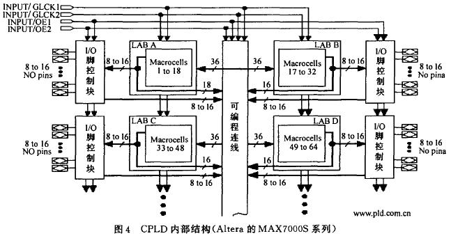 CPLD芯片选用Altera公司的MAX7000S系列器件EPM7128SLC84,它有128个逻辑宏单元,逻辑门数为2500门,在MAX+PLUS II软件环境下,采用VHDL和原理图输入相结合的方法进行设计.设计输入完成后,进行整体的编译和逻辑仿真,然后进行转换、布局、布线、延时仿真生成配置文件,最后以4引脚的JTAG 接口方式通过ByteBlaster下载电缆对CPLD进行在线编程(ISP),完成结构功能配置,实现其硬件功能,制成专用芯片.为了避免器件内的设计被他人复制和取出,可通过对MAX7128S内部的一个保密位编程,对设计进行加密.当对器件重新编程时,保密位连同其他的编程数据均能擦除和重写.MAX7000系列是工业界中速度最快的高集成度可编程逻辑器件系列.它的系统结构如图4所示.它们的输入寄存器的建立时间非常短,能提供多个系统时钟且有可编程的速度/功率控制.