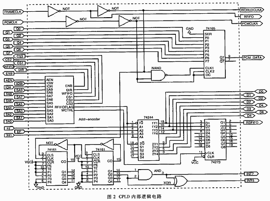 CPLD内部逻辑电路如图2所示。图中,虚线框内为CPLD内部电路,虚线框外为CPLD的I/O口。