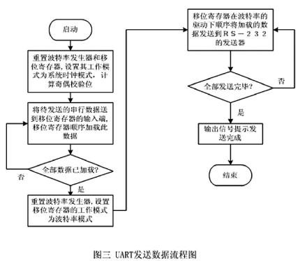 接收过程指的是UART监测到RS-232总线上的数据,顺序读取串行数据并且将其输出给CPU的过程。当信号监测器监测到新的数据(RS-232输入逻辑变为0,即RS-232传输协议的起始位)就会触发接收过程,其流程图如图二所示。首先UART内核会重置波特率发生器和移位寄存器,并且设置移位寄存器的工作模式为波特率模式,以准备接收数据。其次,移位寄存器在波特率始终的驱动下工作,不断读取RS-232串行总线的输入数据,并且将数据保存在内部的寄存器内。接收完成后,UART内核会对已接收的数据进行奇偶检验并且输出校验结果。最后,UART内核会重置信号监测器,以准备进行下一次数据接收。