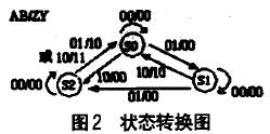 根据上面的功能描述,可用三个状态S0,S1,S2表示,未投币前的初始状态为S0,投入五角硬币以后为S1,投入一元硬币后(包括投入一枚一元硬币和投入两枚五角硬币的情况)为S2,再投入一枚五角硬币后电路返回S0,同时输出为Z=1,Y=0;如果投入的是一枚一元硬币,则电路也应能返回S0,同时输出为Z=1,Y=1。根据上面的分析可得到状态转换图如图2所示。