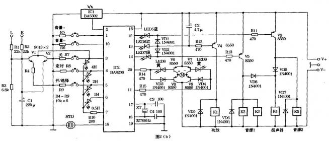 2.音源选择:按开/选择键,IC2第13脚先输出低电平,使红色LED6点亮作电源接通显示,并使V4导通,K1得电吸合,将功放电源接通。3秒后第13脚恢复为高电平,第14脚转为低电平,使绿色LED7点亮作音源1接通显示,V5导通,使K2、K3得电吸合,接通图2(a)中的音源1信号和电源。因VD2作用,V4仍导通,使K1吸合接通功放电源。同时经VD8也使K4得电吸合接通扬声器。