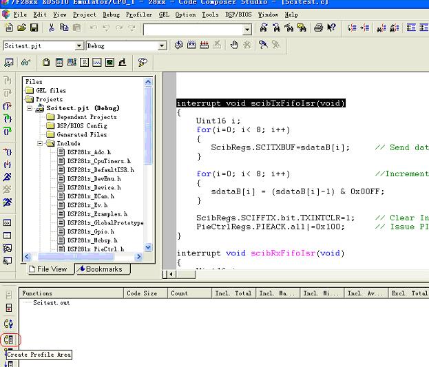 5. 以剖析函数为例,找到该函数,然后将光标放在该函数的函数名上,选择建立剖析区域按钮,图中用红框框起来的那个按钮。如图6所示。
