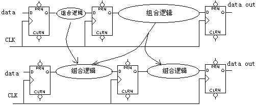 对于图3的上半部分,它时钟频率受制于第二个较大的组合逻辑的延时,通过适当的方法平均分配组合逻辑,可以避免在两个触发器之间出现过大的延时,消除速度瓶颈。