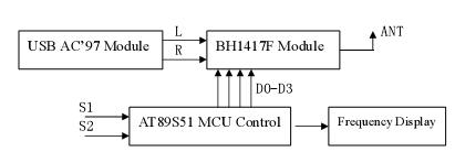 电路主要由三部分组成:USB声卡,立体声调频发射模块,频率显示控制。 USB 声卡和电脑连接后,会输出立体声音频信号,音频信号传送至调频发射模块,经过处理后,变换成调频电波发射出去。同时,由单片机组成的系统会控制调频发射模块的 D0—D3 四个引脚的高低电平,从而控制发射频率,单片机也会把发射频率用数码管显示出来。原理框架图如下: