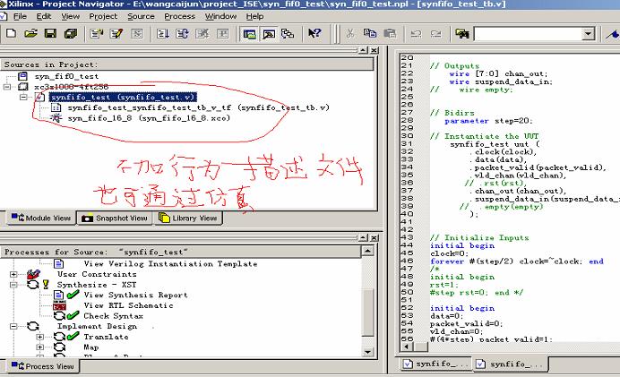 IP核生成器生成 ip 后有两个文件对我们比较有用,假设生成了一个 asyn_fifo 的核,则asyn_fifo.veo 给出了例化该核方式(或者在 Edit->Language Template->COREGEN 中找到verilog/VHDL 的例化方式)。asyn_fifo.v 是该核的行为模型,主要调用了 xilinx 行为模型库的模块,仿真时该文件也要加入工程。(在 ISE中点中该核,在对应的 processes 窗口中运行“ View Verilog Functional Model ”即可查看该 .v 文件)。如下图所示。