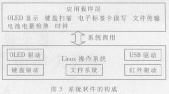 系统软件是整个系统的灵魂, 其设计的好坏直接影响系统的稳定性和可扩展性等性能。系统设计将软件分为两层结构, 如图5 所示。最下面一层为操作系统层, 主要实现对Linux 操作系统的移植和各种设备驱动程序的编写, 包括OLED 模块、USB Device、红外、键盘等设备驱动程序。上一层为应用程序层, 主要实现卡信息显示、键盘扫描、电子标签卡读写、文件传输、时钟以及电池电量检测等功能。