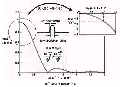 图6是用脉冲幅宽之信号频率频谱(spectre)与依存于站立时间频谱两者相乘的积所求得的总合频谱,若将模拟信号频域的观念加入该频谱时,当频谱变成-3dB(0.7倍)时(图7),也就是说上述Direct Rambus接口的,MHz的计算结果与图5的观察结果完全一致,证明电路板有诱电损失是正确的判断。