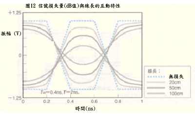所谓诱电损失是指传送途中导体(电线)与接地线之间的电容器(capacitor)储蓄的电荷发生漏电所造成的损失。当电路板的传送速度超过2.5Gbit/sec时,诱电损失与导体损失所产生的影响几乎相同,因此必需藉由基板材质的诱电正接(tanδ)或是导线图案(pattern)的尺寸以及其它条件的改变,以模拟分析的方式调查诱电损失与导体损失对传送波形的影响,再根具上述结果实施对策,使超过GHz的信号可作高速传送。