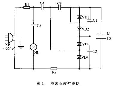本电路如图1所示,它是由紫外线灯管和四倍压整流屯路组成。当接通220V交流电源时,二极管VD1、VD2、VD3、VD4和电容C1、C2、C3、C4组成的四倍压整流电路产生直流高电压。而此时紫外灯管HL随220V电源接通而点亮,其波长约为250 mm,利用蚊虫的趋光效应来引诱蚊虫,当蚊虫扑向紫外灯管HL时,内于灯网布满高压,因而蚊虫受到电击后即刻死亡。