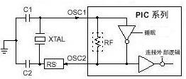 XT、 LP、HS三种方式中,需一晶体或陶瓷谐振器连接到单片机的OSC1/CLKIN和OSC2/CLKOUT引脚上,以建立振荡,如图1所示。电阻RS常用来防止晶振被过分驱动。在晶体振荡下,电阻RF≈10MΩ。对于32KHZ以上的晶体振荡器,当VDD>4.5V时,建议C1=C2≈30PF。(C1:相位调节电容; C2:增益调节电容。)