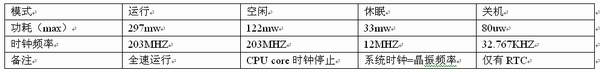 我们以SAMSUNG S3C2410X (32bit ARM 920T内核)为例,它提供了四种工作模式:正常模式、空闲模式、休眠模式、关机模式,各种模式的功耗如下: