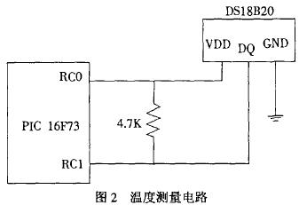 在温度测量电路中采用Dallas公司生产的1-Win总线数字温度传感器DS18B20。DS18B20是3引脚TO-92小体积封装形式;温度测量范围为-55℃-+125℃,可编程为9位-12位MD转换精度,测温分辨率可达0.0625℃,被测温度以带符号扩展的16位数字量方式串行输出;其工作电源既可从端脚引入,也可采用寄生电源方式产生。本系统采用从端脚引入工作电源方式。温度测量电路如图2所示。