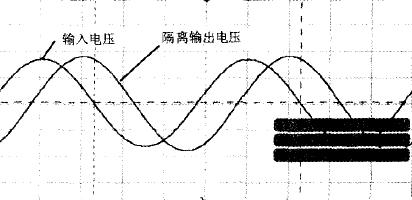 图3和图4分别为新电路和AD210的输入输出电压波形图。其中横轴为时间,纵轴为输出电压幅值。由实验可以看出,在输入频率为1 kHz时,本隔离电路和集成模拟隔离放大器AD210具有相同的线性度和相同的传输延时。但在高频端时,本电路的传输延时要远小于集成隔离放大电路的传输延时。由图3可知,在40kHz时,本电路的相位差约为14°。此时的输出电压和输入电压没有发生畸变,为线性传输。而集成模拟隔离放大器在10 kHz时的传输延时约为72°。可见,本隔离放大电路的传输带宽要优于集成模拟隔离放大器。