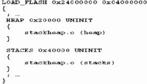 Scatterloading机制提供了一种指定代码和静态数据布局的方法。下面介绍如何放置应用程序的堆栈和heap。