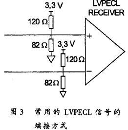 LVPECL电平信号也是适合高速传输的差分信号电平之一,最快可以让信号以1 GBaud波特的速率传输。它的每一单路信号都有一个比信号驱动电压小2 V的直流电位,因此应用终端匹配时不能在正负两条差分线之间跨接电阻(如果在差分线之间跨接电阻,电阻中间相当于虚地,直流电位将变成零),而只能将每一路进行单端匹配。