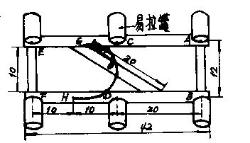 ②将3组易拉罐对称平行地用带帽螺丝固定于支架上。AB、CD、EF的间距(指易拉罐)为10厘米;AC、CE、BD、DF的间距为20厘从G、H分别为CE和DF的中点(即10厘米处),将细铜管(或铜丝)弯成环形(直径25厘米),用借帽螺丝固定于G、H扎内,并使铜线环垂直于支架。
