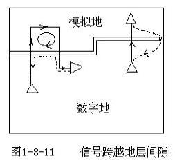 要注意的是,在数模混合电路设计中不能让模拟地和数字地交叠,这样两者会因为容性耦合而产生干扰噪声。另外,任何信号线都不能跨越地间隙或是分割电源之间的间隙(如图1-8-11),在这种情况下,地电流将会形成一个大的环路。流经大环路的高频电流会产生辐射和很高的地电感,如果流过大环路的是低电平模拟电流,该电流很容易受到外部信号干扰,这些都会引起严重的EMI问题。