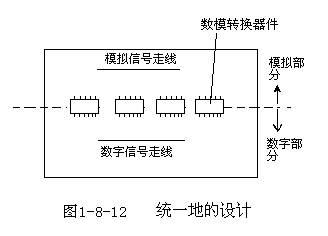 接地技术中还有一个很重要的部分就是数字电路与模拟电路的共地处理,即电路板上既有高速逻辑电路,又有线性电路,如何降低数字信号和模拟信号间的相互干扰呢?一般说来,数字电路的频率高,而模拟电路的对噪声的敏感度强,正因为如此,高频的数字信号线要尽可能远离敏感的模拟电路器件,同样,彼此的信号回路也要相互隔离,这就牵涉到模拟和数字地的划分问题。一般的做法是,模拟地和数字地分离,只在某一点连接,这一点通常是在PCB板总的地线接口处,或者在数模转换器的下方,必要时可以使用磁性元件(如磁珠)连接,如图1-8-10: