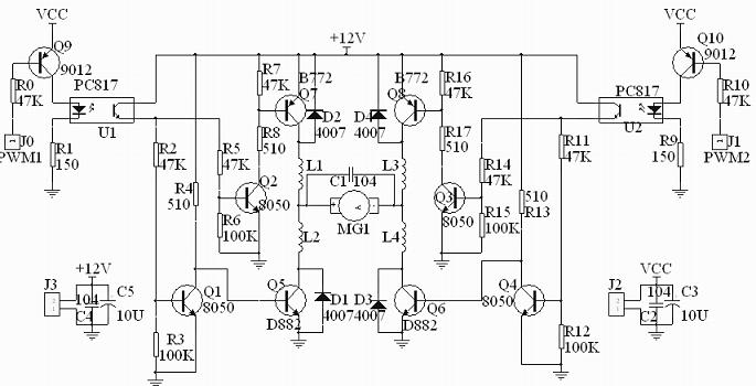 驱动电路采用H型桥式PWM脉宽调制驱动形式,如图3-1所示。电路主要由大功率三极管B772、D882、三极管8050和光电耦合器等元件组成。该驱动电路可控制电机的正转、反转和停止。与单片机的接口电路采用光电耦合器隔离。用单片机的I/O口控制驱动电路的两个控制端,当控制端PWM1为低电平,控制端PWM2为高电平时,左边的光电耦合器导通,右边的光电耦合器不导通,Q1、Q2、Q6、Q7全部深度饱和导通,而右边的Q3、Q4、Q5、Q8全部截止,由于Q6、Q7深度饱和导通,所以其Vceo只有约0.3伏,在驱动管上消耗的电压很小,此时电机正转。反之,当控制端PWM1为高电平,控制端PWM2为低电平时,电机反转。当控制端PWM1和PWM2同时为高电平或低电平时,电机停止。