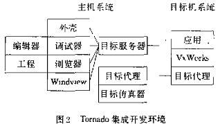 作为一种功能强犬而且比较复杂的操作系统,仅仅依靠人工编程调试很难发挥它的功能.必须要有与之相适应的开发工具.Tornado就是为开发VxWorks应用系统提供的集成开发环境.在开发过程中,可以通过Tornado中包含的工程管理软件.将自己的代码与VxWorks的核心有效地组台起来. 图2表明了Tornado开发环境的基本模型.