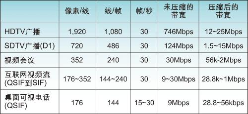 表:各种视频格式的典型带宽。