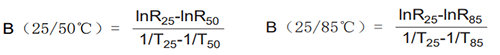 基中R25,R50,R85为相应环境温度下测得的阻值; T25,T50,T85为相应摄氏温度对应的绝对温度值。